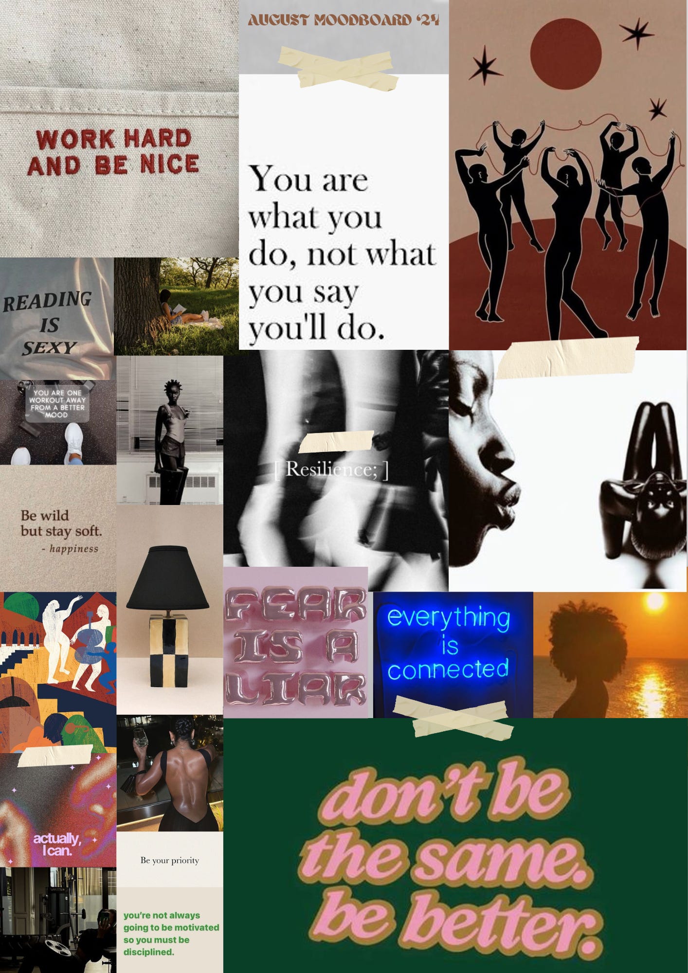 You know, coming to newsletter 2 was a struggle - I was stuck with what to say, how to say it, assessing what July was for me and identifying what I wanted August to look like. If you know me, you know that I am a massive overthinker - so of course I’ve been overthinking this journal entry disguised as a newsletter - haha. One of my friends said to me earlier in the month that I need a thinking holiday - and yep, she was right. I have no idea what that even looks like, but it sounds like something I should try. So I’ve decided to take time off of work at the end of the month, which as an entrepreneur, it can be quite difficult (for me) to do. But I’m actually quite proud because I never do this without external reason and this time, it's simply to just turn off and try out this thinking holiday thing. Which leads me to my mood board for the month. I said I wanted to romanticize my life more and even though July was a good month, there wasn’t enough romance - from me, not from anyone else lol. So taking this month to continue digging deeper into my self development and continued self discovery, but also more art, more fresh air, more self love, more self care, more spiritual awareness, more solo dates and hopefully spending more time with you guys.